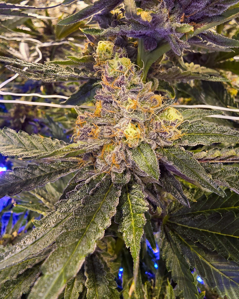 Deep violet tones wrap tightly around dense, resin-soaked structure, with bright orange hairs cutting through dark forest green. The contrast is bold and unmistakable, giving the flower a sharp, high-definition look under any light. Every nug feels dense and extremely substantial in the hand, with a greasy sheen that indicates a powerful smoke is very near. This one made its way to us through Champelli, and it carries that parallel level of presence.
